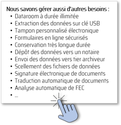 Notre solution propose en standard toutes les fonctionnalités que vous êtes en droit d'attendre d'une dataroom.